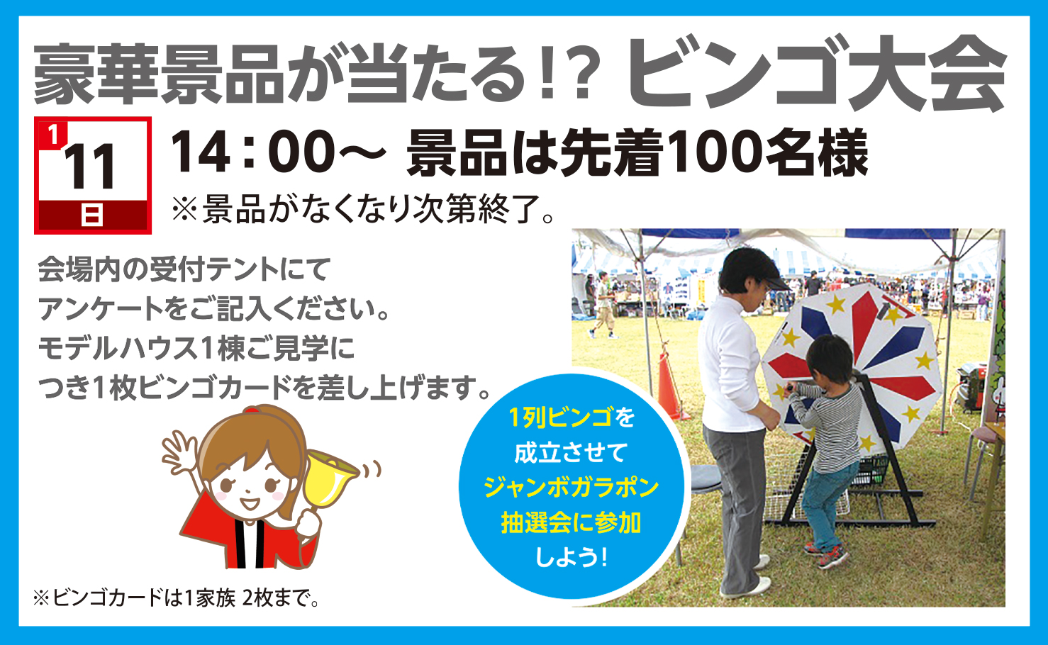 1列ビンゴを成立させてジャンボガラポン抽選会に参加しよう! 会場内の受付テントにてアンケートをご記入ください。モデルハウス1棟ご見学につき1枚ビンゴカードを差し上げます。 人気のキャラクターグッズを当てよう! ●日程:1/11(日)●時間:14:00~●参加:景品は先着100名様 ※景品がなくなり次第終了。※ビンゴカードは1家族2枚まで。 見学予約|1回に3棟まで可能