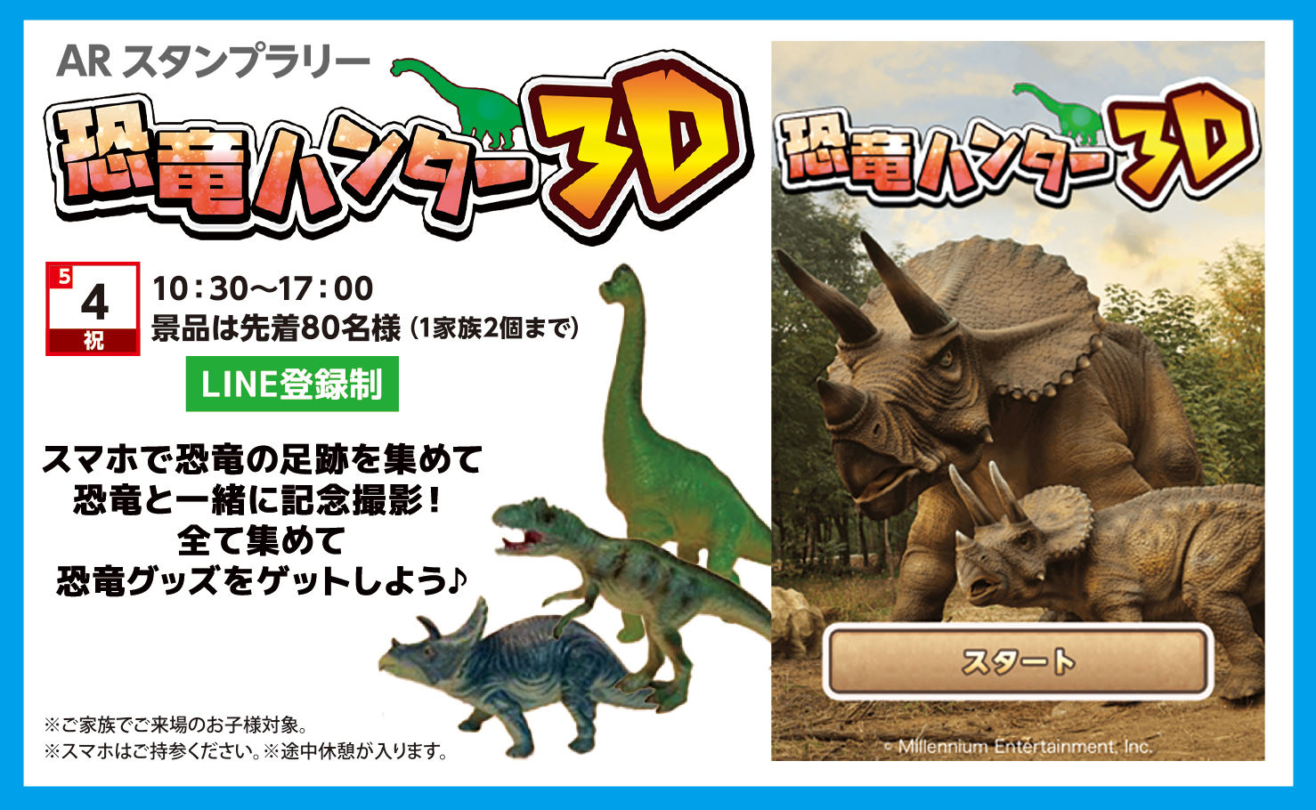 スマホで恐竜の足跡を集めて恐竜と一緒に記念撮影!全て集めて恐竜グッズをゲットしよう♪ ●日程:5/4(祝)●時間:10:30~17:00●参加:LINE登録制・景品は先着80名様(1家族2個まで) ※ご家族でご来場のお子様対象。※スマホはご持参ください。※途中休憩が入ります。 見学予約|1回に3棟まで可能