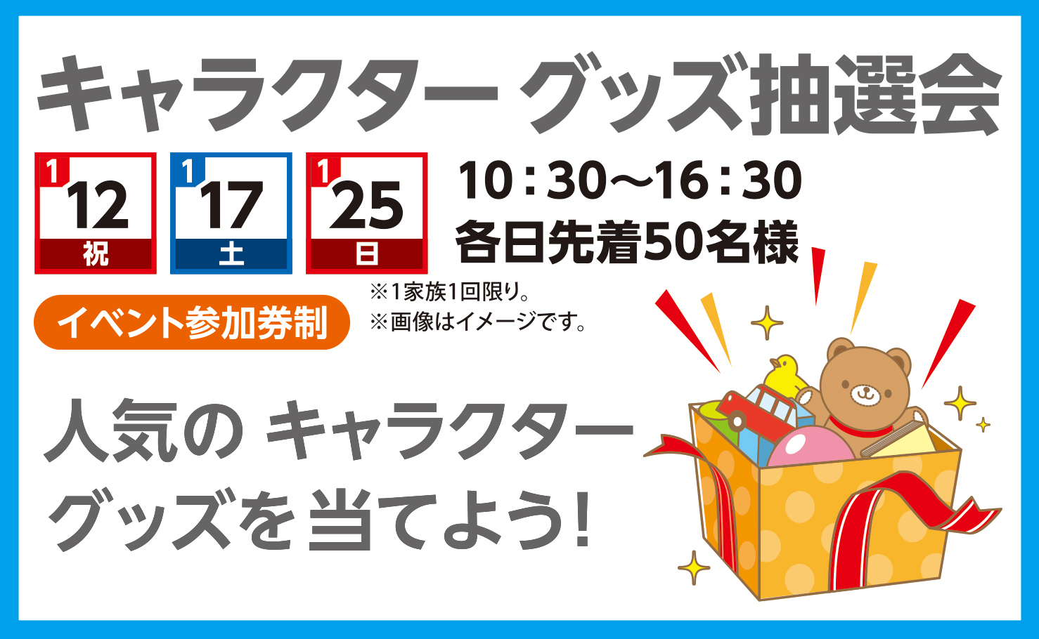 人気のキャラクターグッズを当てよう! ●日程:1/12(祝)・1/17(土)・1/25(日)●時間:10:30~16:30●参加:各日先着50名様・イベント参加券制 ※1家族1回限り。※画像はイメージです。 見学予約|1回に3棟まで可能