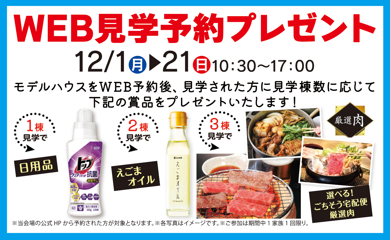 モデルハウスをWEB予約後、見学された方に見学棟数に応じて下記の賞品をプレゼントいたします!