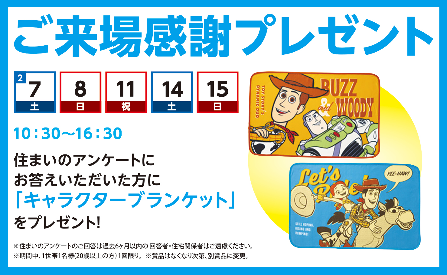 住まいのアンケートにお答えいただいた方に「キャラクターブランケット」をプレゼント! ●日程:2/7(土)・2/8(日)・2/11(祝)・2/14(土)・2/15(日)●時間:10:30~16:30●参加:アンケート回答者対象 ※住まいのアンケートのご回答は過去6ヶ月以内の回答者・住宅関係者はご遠慮ください。※期間中、1世帯1名様(20歳以上の方)1回限り。※賞品はなくなり次第、別賞品に変更。 見学予約|1回に3棟まで可能